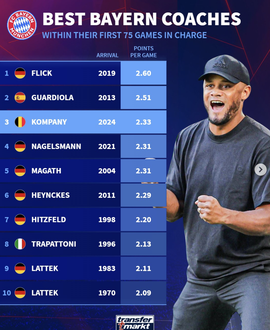 虎撲11月27日訊 德轉(zhuǎn)盤點(diǎn)了歷任拜仁主帥執(zhí)教球隊(duì)前75場(chǎng)比賽的場(chǎng)均積分排行榜。