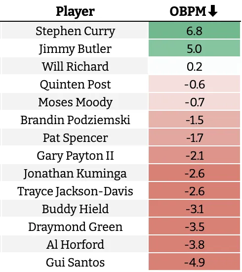美媒Automatic分享數(shù)據(jù):勇士全隊(duì)目前進(jìn)攻端BPM值,只有37歲的庫里和36歲的巴特勒為正,其余人全為負(fù)值。