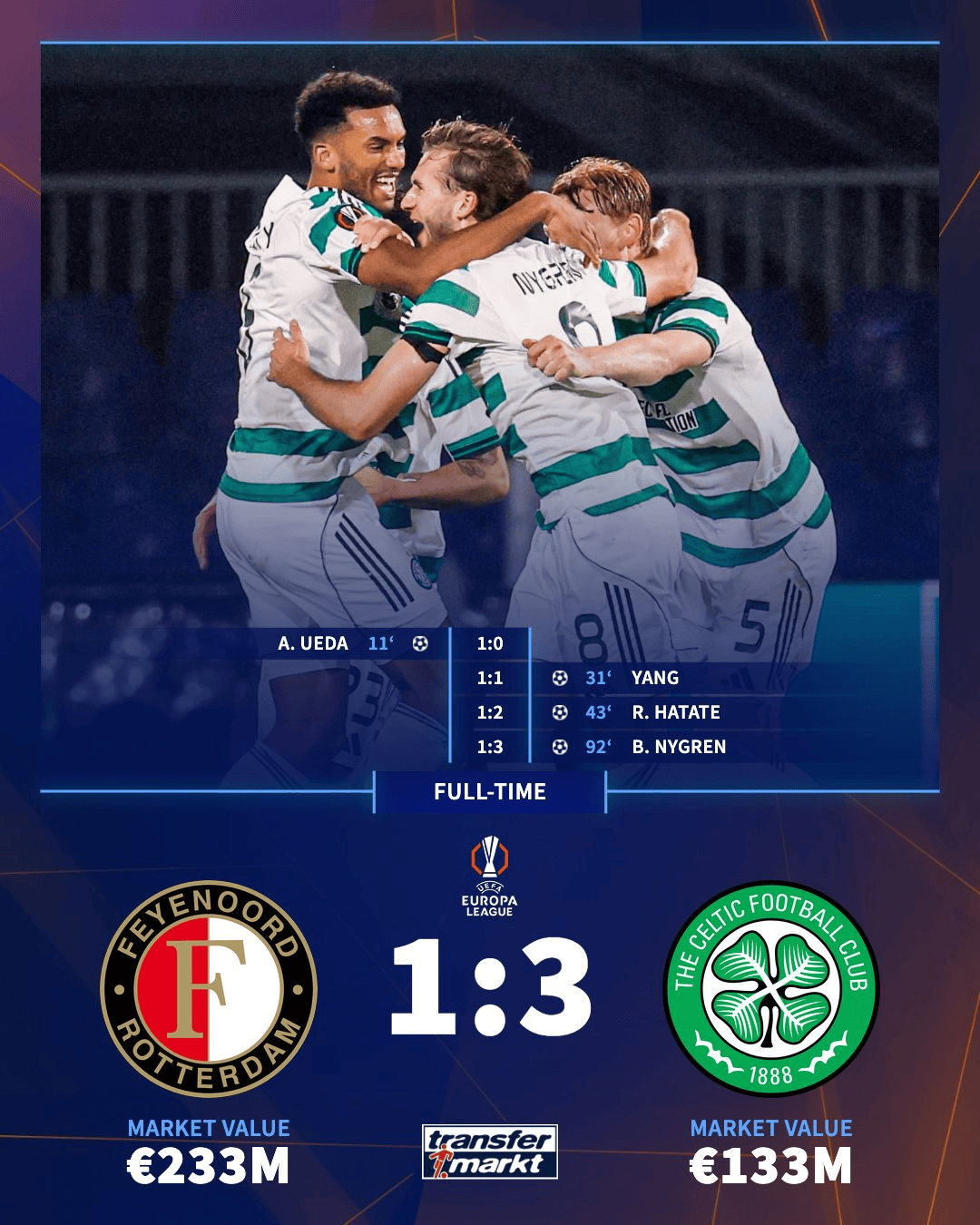 虎撲11月28日訊 歐聯(lián)聯(lián)賽階段,凱爾特人在全場(chǎng)被動(dòng)的特人情況下3-1客勝費(fèi)耶諾德。