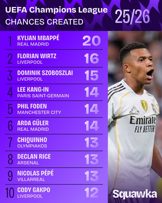 虎撲11月27日訊 本輪歐冠,皇馬客場(chǎng)4-3奧林匹亞科斯。歐冠Squawka數(shù)據(jù)統(tǒng)計(jì),創(chuàng)造次數(shù)次第姆巴佩是姆巴本賽季至今歐冠聯(lián)賽中唯一一位創(chuàng)造20+次機(jī)會(huì)的球員。